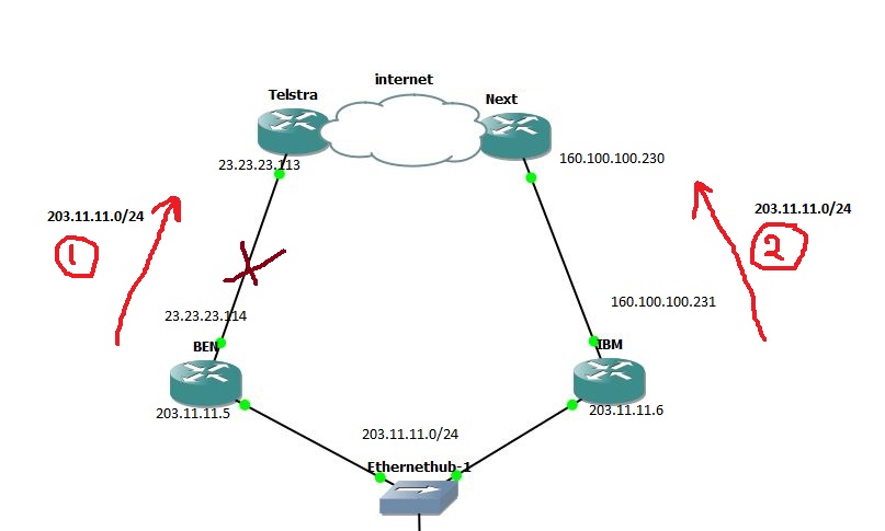 So the routers under my admin domain are BEN and IBM. My primary router is BEN and my public IP range I am advertising is 203.11.11.0/24.