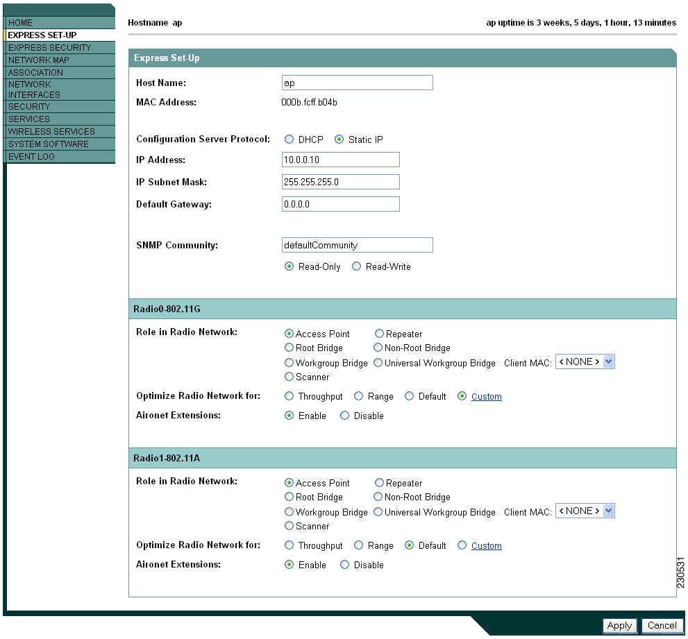Enter the case-sensitive password Cisco and press Enter. Your page may differ depending on the access point model you are using. The Express Setup screen appears. Figure 4-1 and Figure 4-2 shows the Express Setup page for the 1100 series access points. Your pages may differ depending on the access point model you are using.