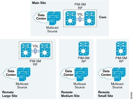 It is assumed that each community college site has a wide range of local multicast sources in the data center for distributed community college IT-managed media and student research and development applications. In such a distributed multicast network design, Cisco recommends deploying PIM RP on each site for wired or wireless multicast receivers and sources to join and register at the closest RP. The community college reference design recommends PIM-SM RP placement on a VSS-enabled and single resilient core system in the three-tier campus design, or on the collapsed core/distribution system in the two-tier campus design model.