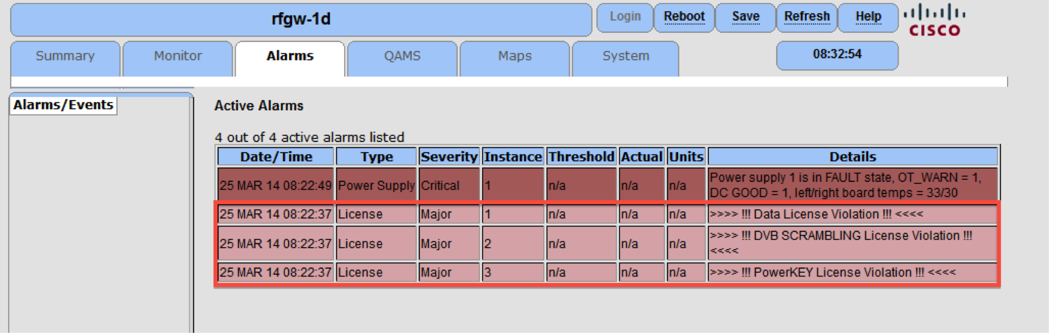 Under the RFGW1 GUI alarm tab, we are seeing a “License Violation” active alarm as per the following screenshot: